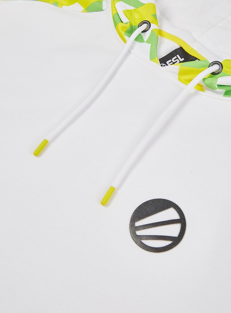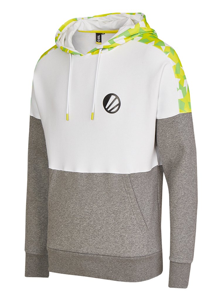 This limited edition hoodie is part of the "ESL In Color" collection launched to celebrate ESL's new visual identity. Inspired by 2018's ESL One Diamond Hoodie, it features ESL's updated ball logo on the chest, on top of cut-and-sew white & grey elements. The hood and shoulder areas are designed in ESL's new stand-out yellow, white and green pattern with a clean white inside and white draw cords. There's a discreet black and white ESL logo on the lower back.